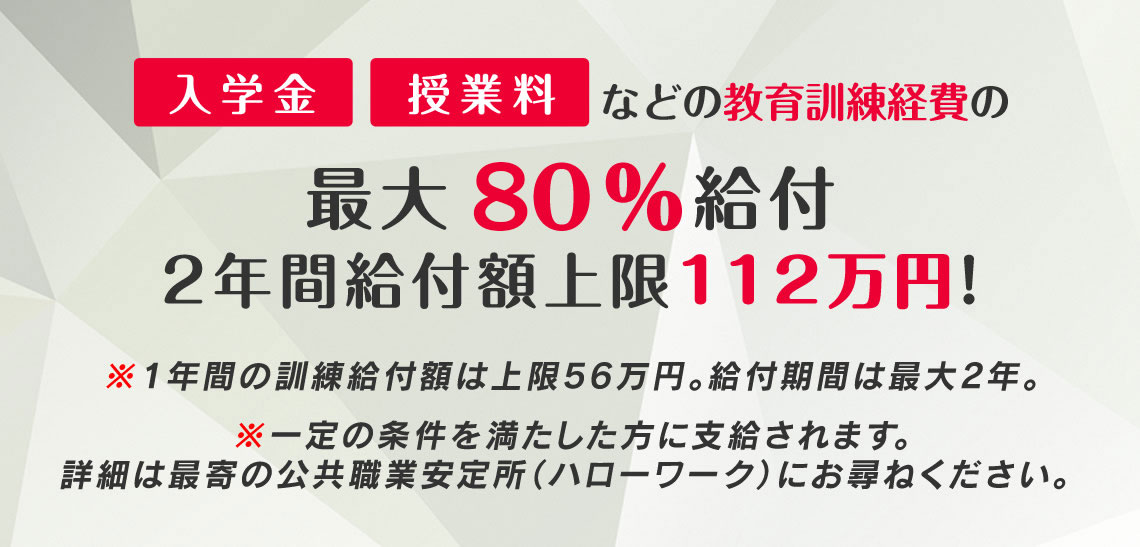※教育訓練経費…入学金や授業料などの受講料。受講料には必須の実習費、教材費を含みますが検定試験受験料、補助教材費等の含まれないものがあります。詳細はお問い合わせください。