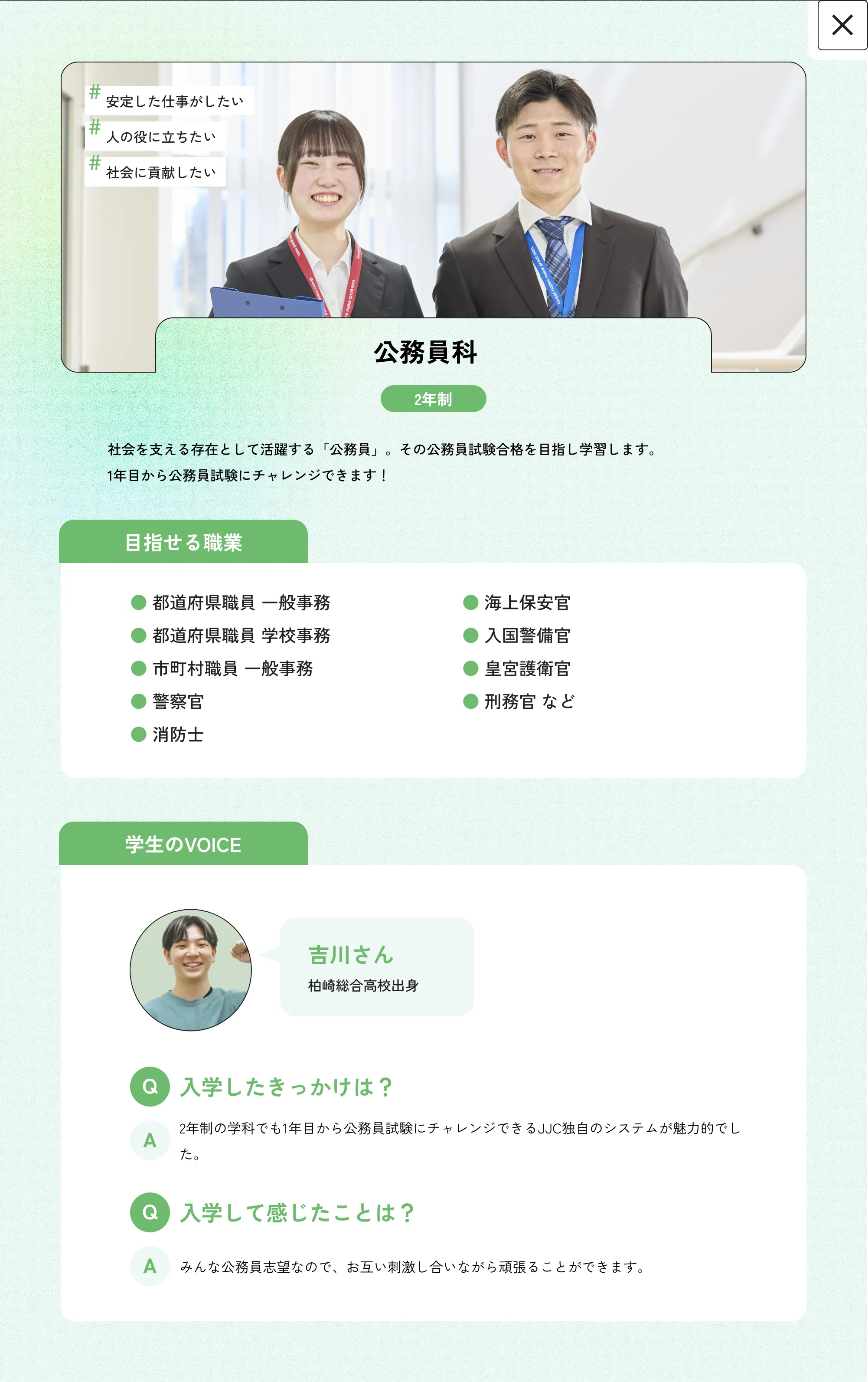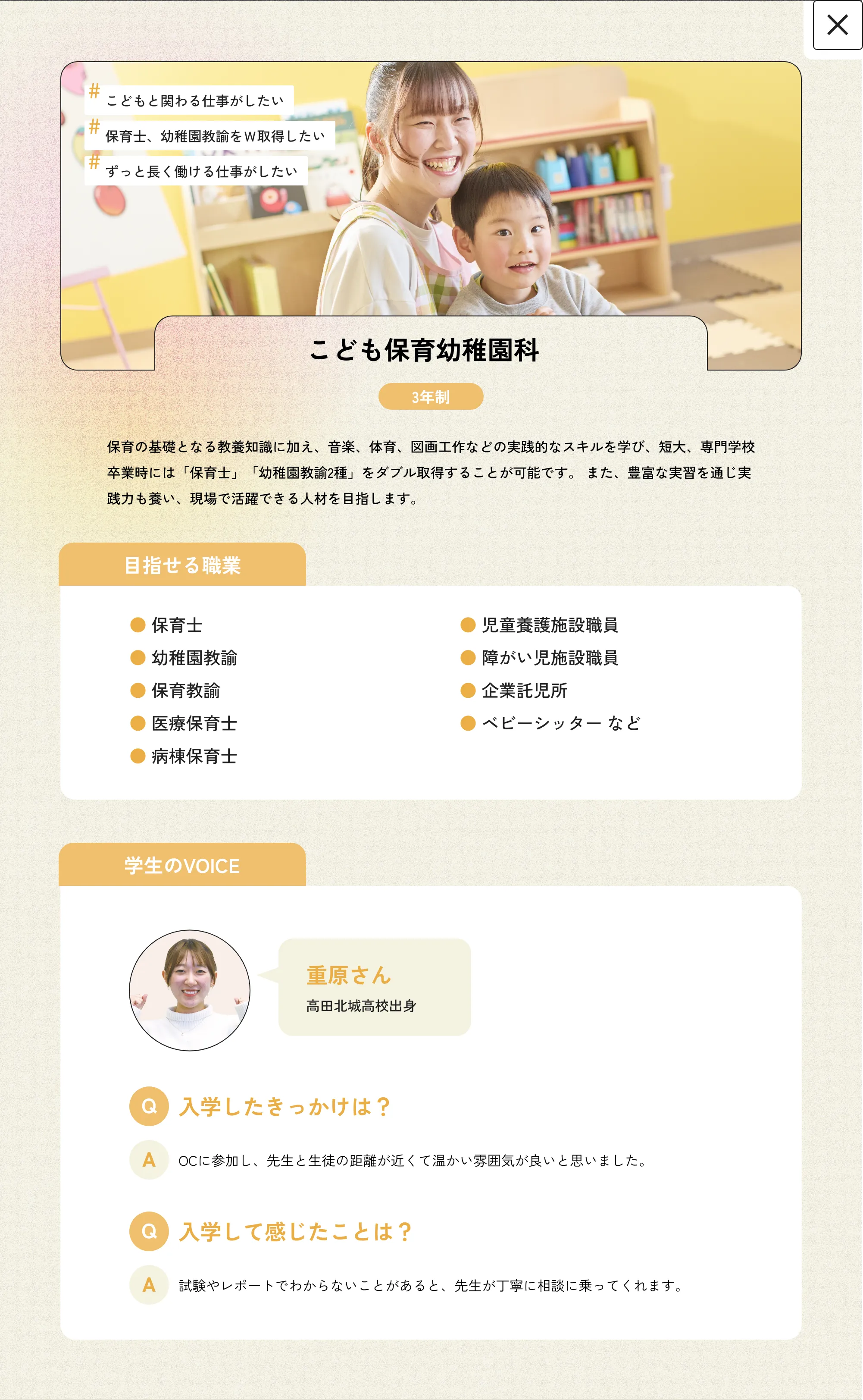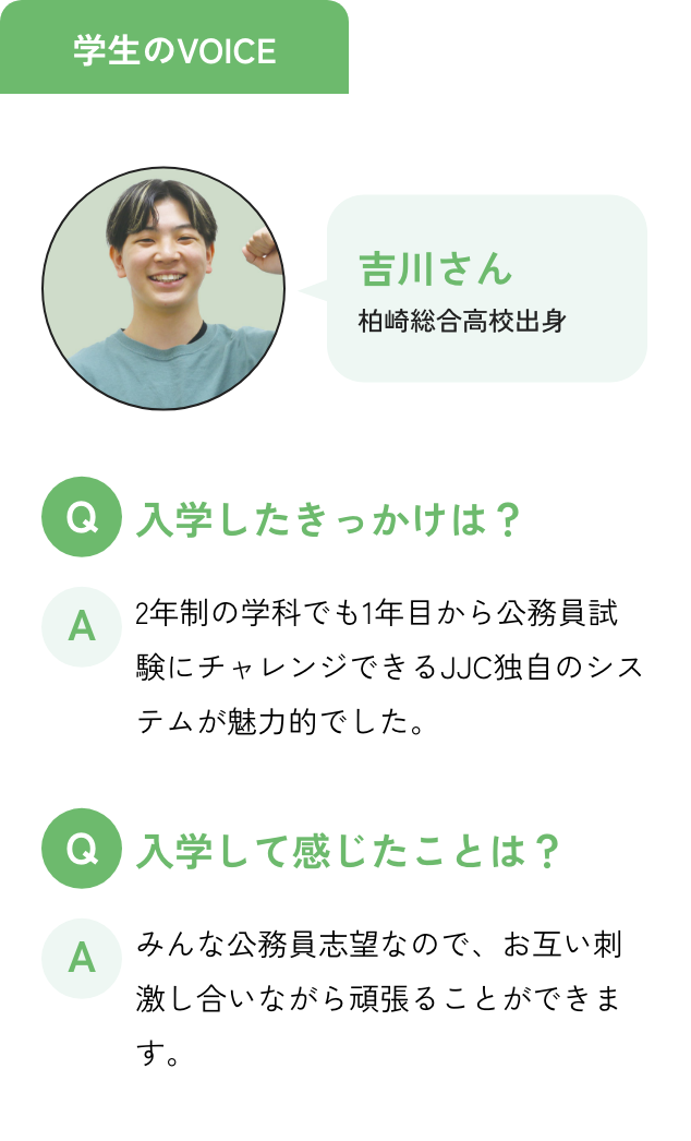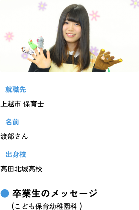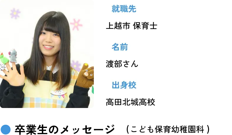 JJCでは各専門分野の先生から授業を受けることができ、内容 の濃い学びに繋がりました。実践的な授業も多く、今とても役 に立っています。公務員試験対策授業のおかげもあり、夢だっ た公立保育園の保育士になれました。笑顔の絶えない、誰に対 しても誠実に向き合っていける保育士でありたいです。