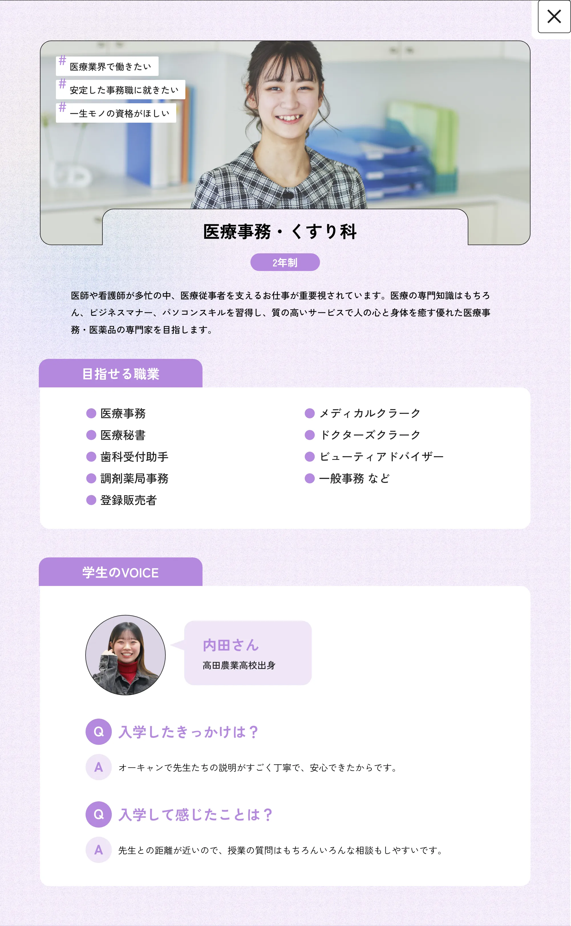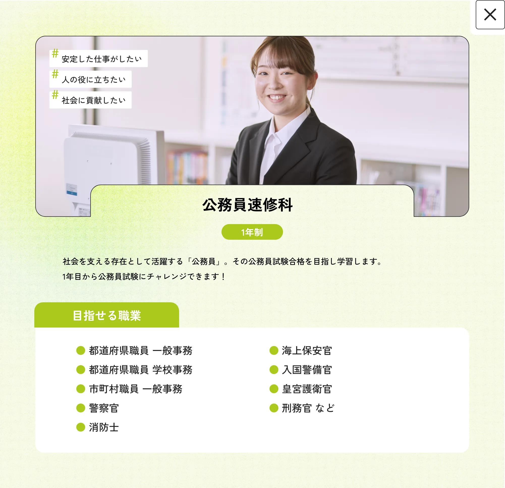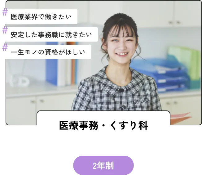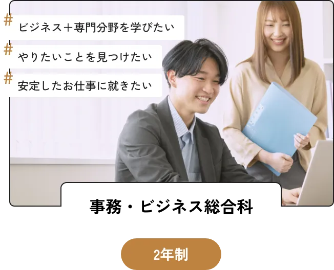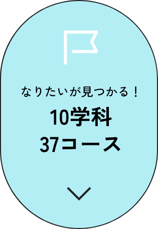保育、医療・薬、事務ビジネス、ホテル・観光、ブライダル、公務員、情報・IT/ゲームなど、多彩な10学科37コースの専門学科があり、