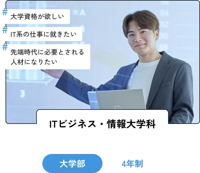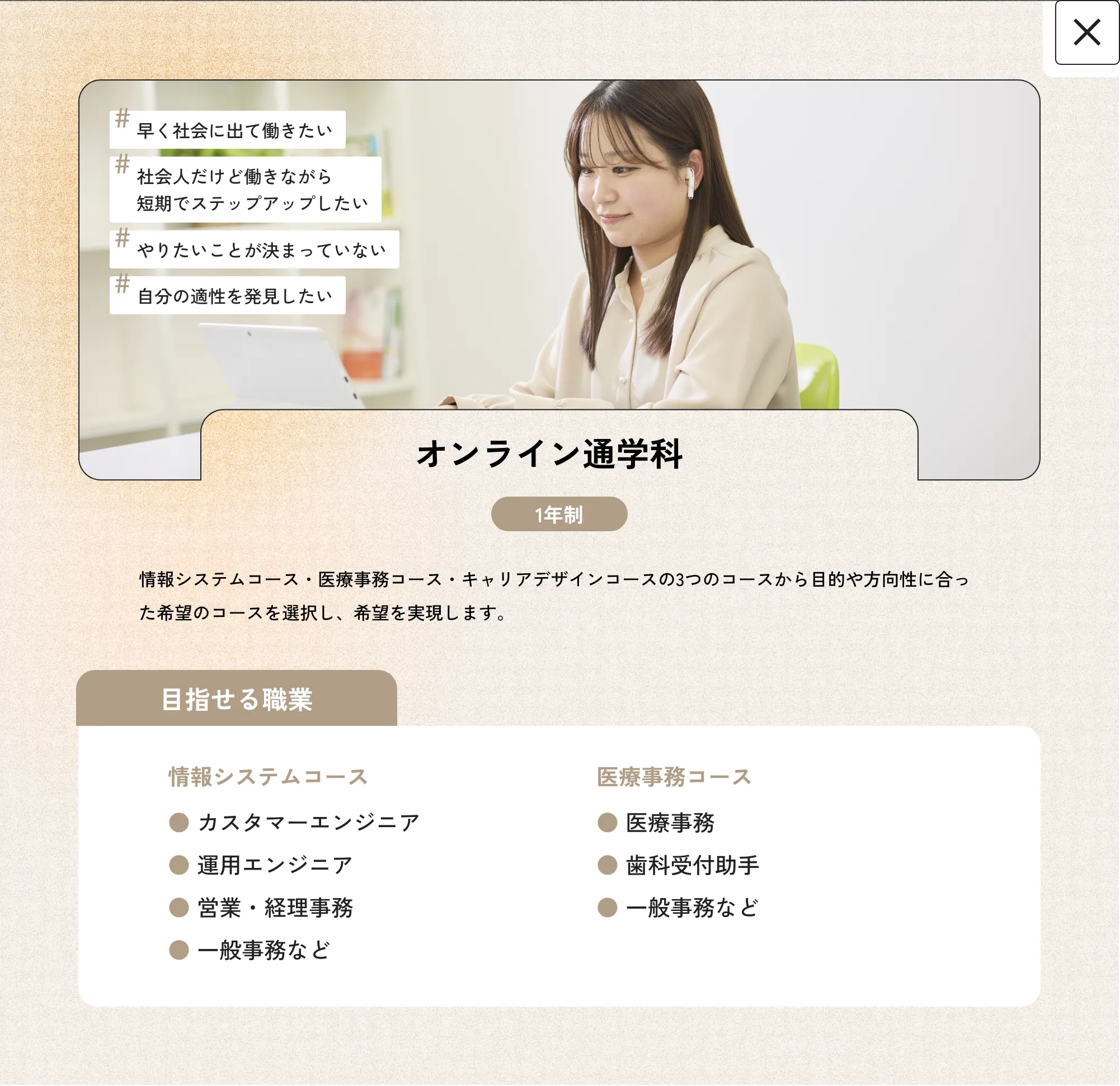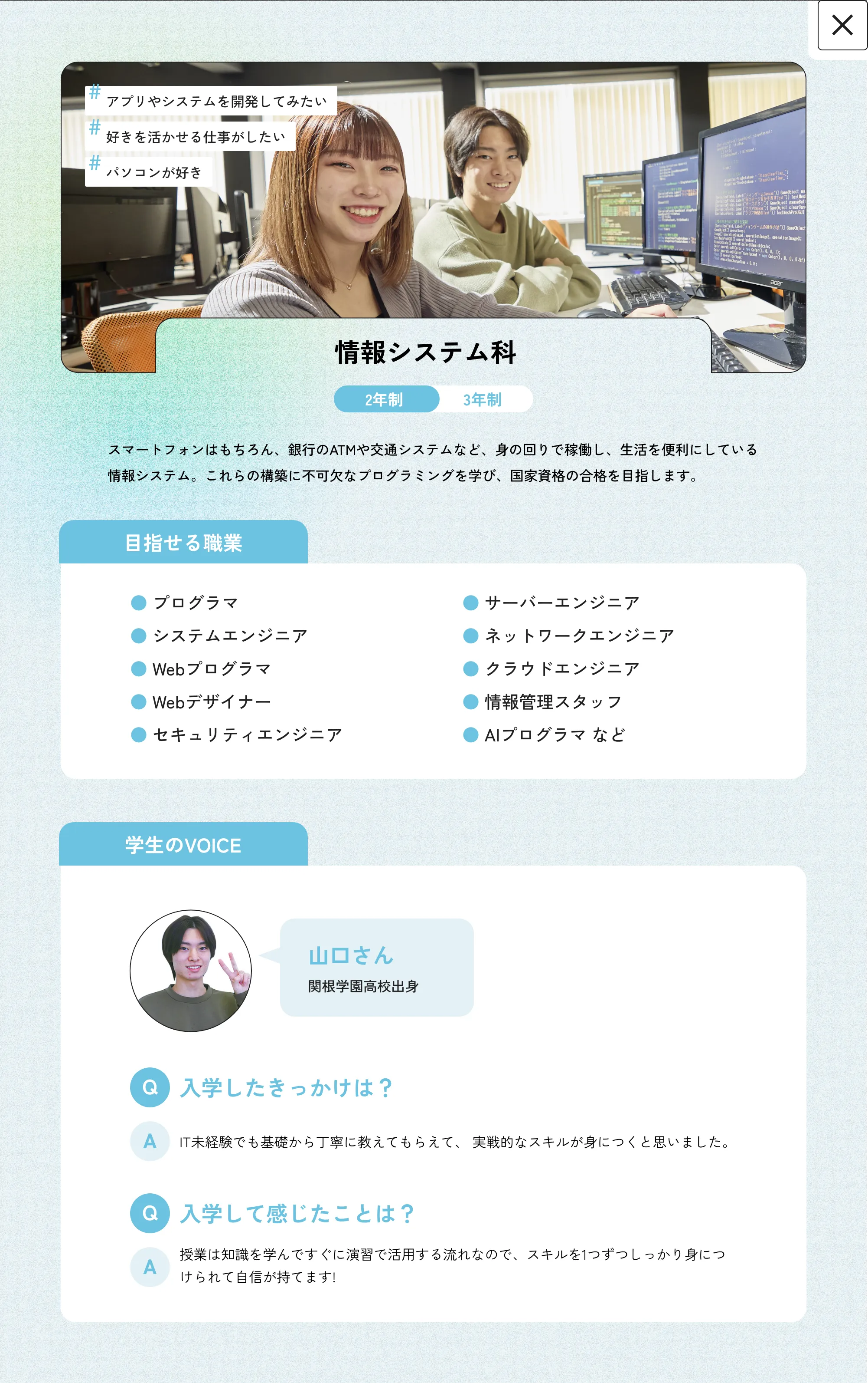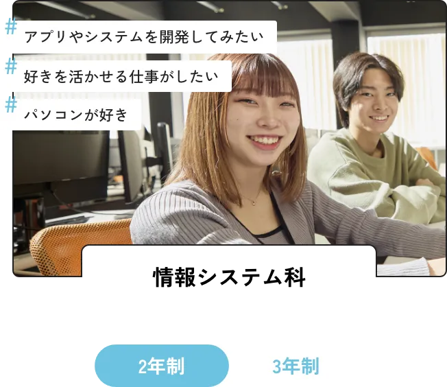 保育、医療・薬、事務ビジネス、ホテル・観光、ブライダル、公務員、情報・IT/ゲームなど、多彩な10学科37コースの専門学科があり、