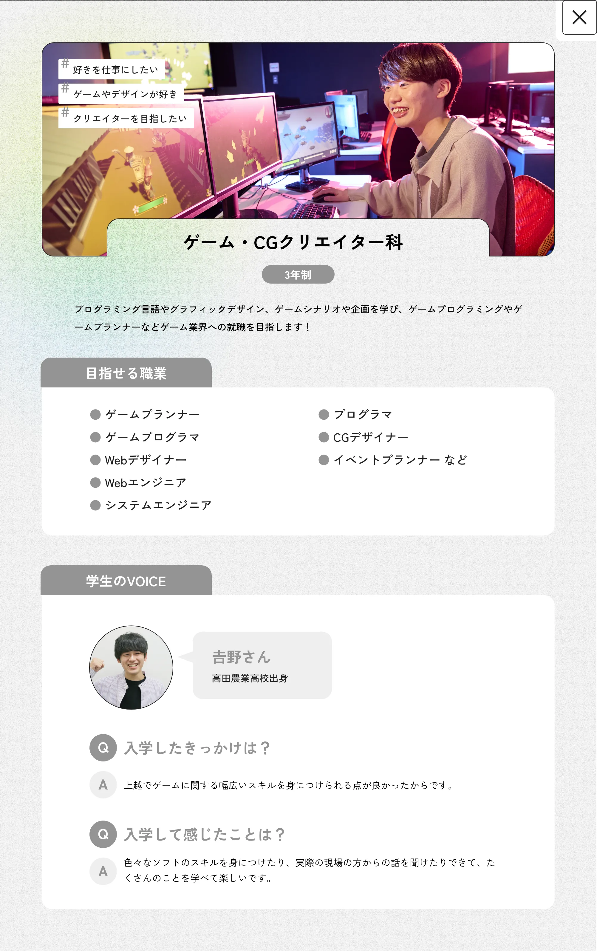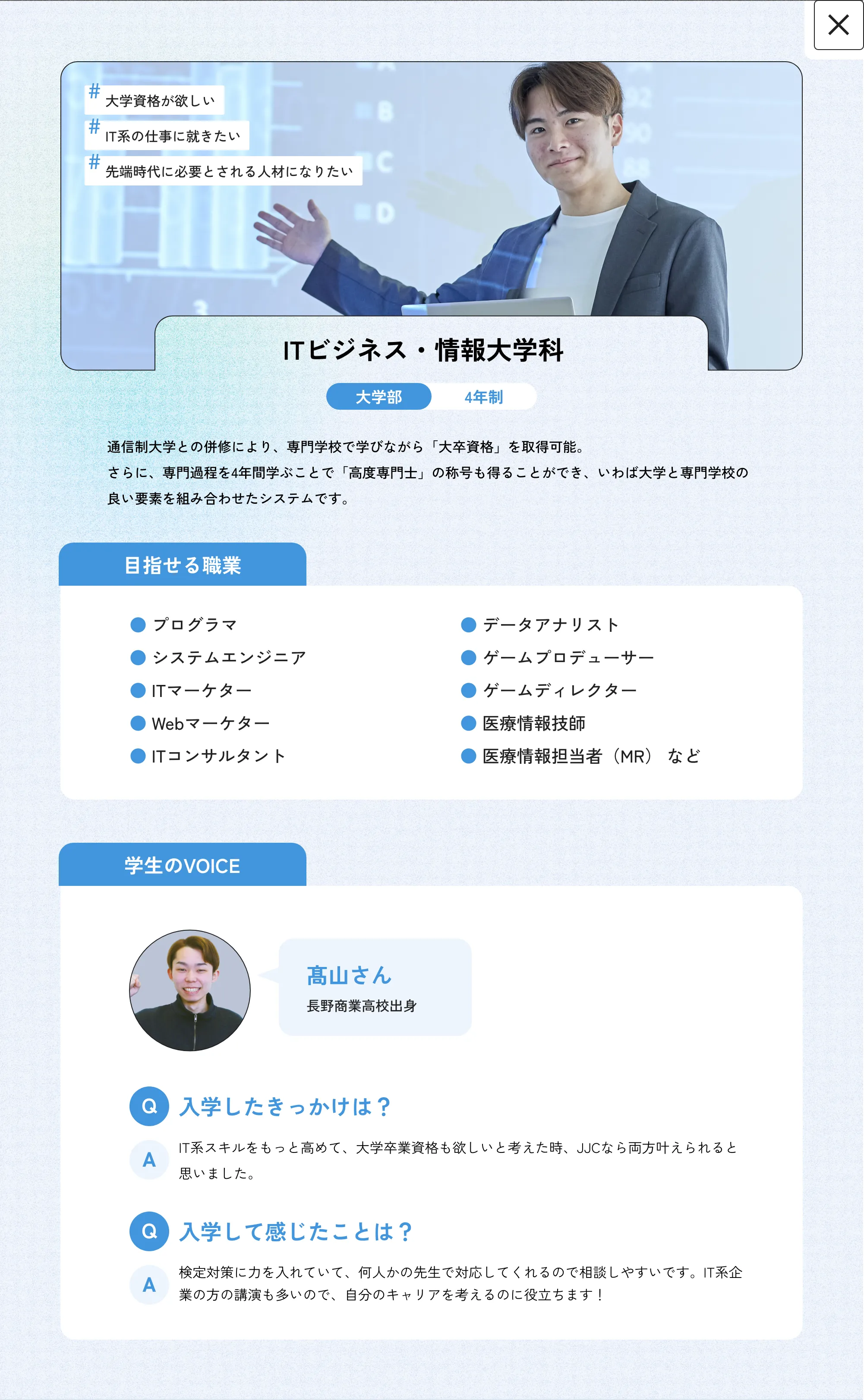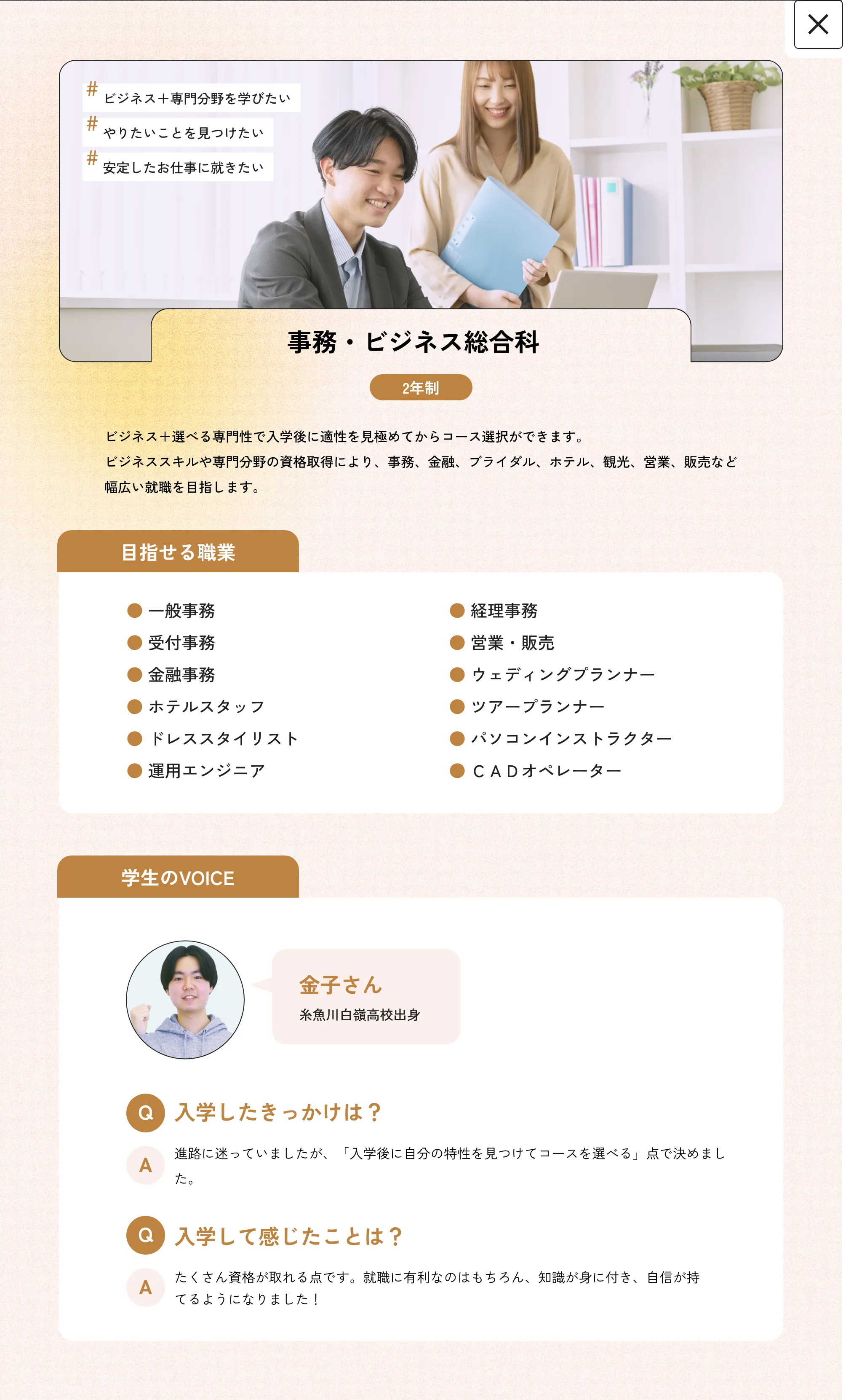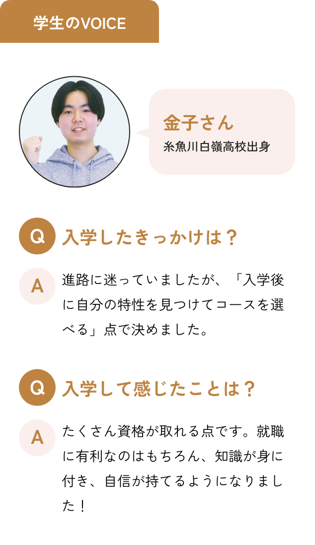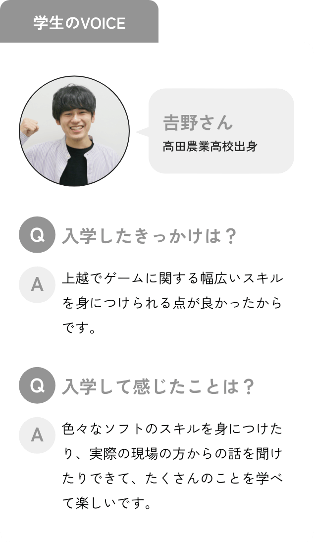 各業界で活躍する人材を育成しております。少人数制の授業と、実務経験豊富な講師による個別指導により、学生一人ひとりの学びを大切にしています。また、上越市や多数の地域企業と連携により、地域で活躍する人材を輩出しております。